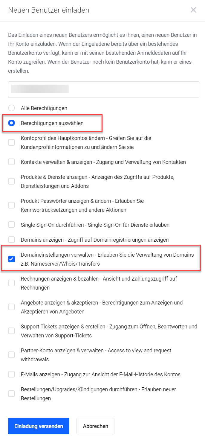 4. Geben sie die Mail Adresse von dem neu zu erstellenden Benutzer an und wählen sie mindestens die Berechtigung "Domaineinstellungen verwalten...." aus. Damit kann der neue User dann die DNS Einträge und Zonen verwalten.