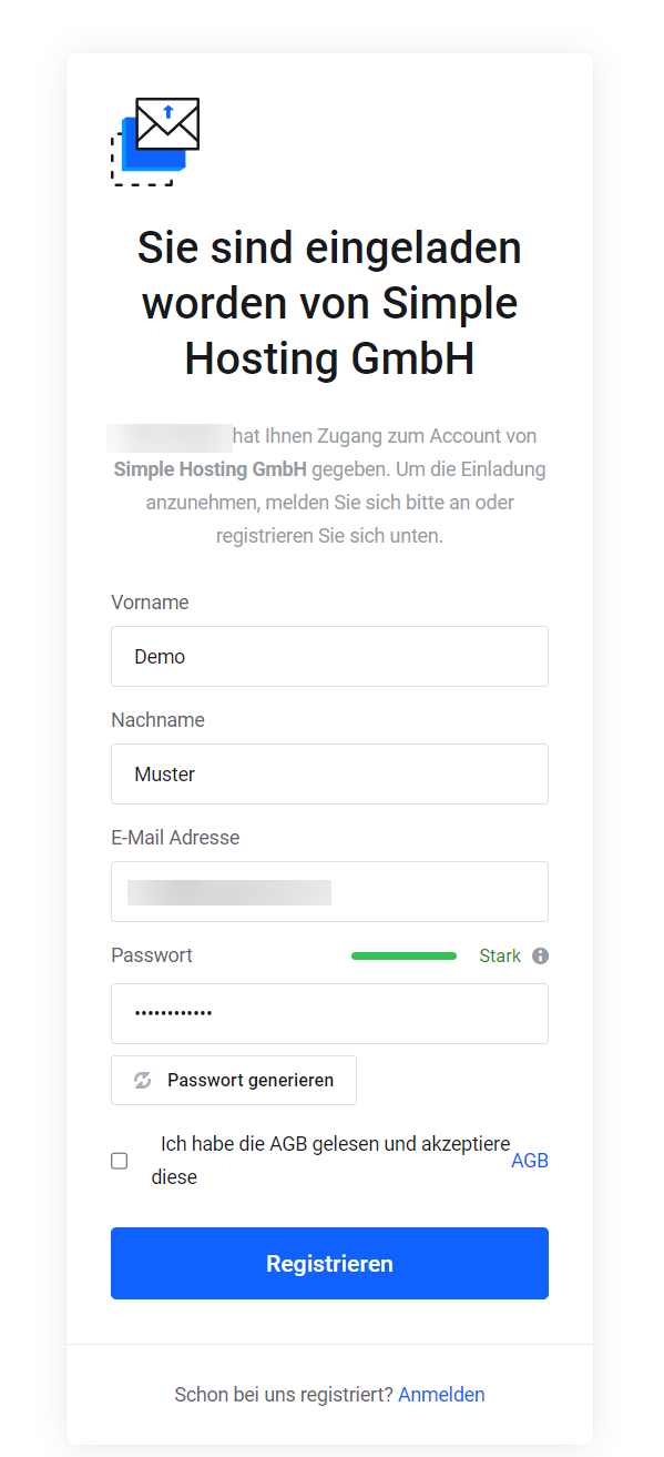 7. Der eingeladene Benutzer kann sich nun via Email Link welcher er erhalten hat registrieren