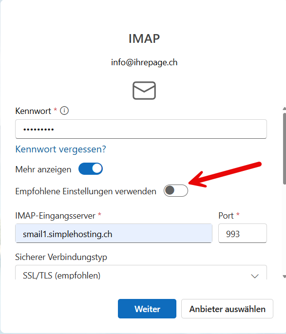 4. Schalten Sie «Empfohlene Einstellung verwenden» aus und passen die Einstellungen von Posteingangsserver, Port und Sicherheit gemäss unseren Angaben welche sie im Willkommensmail erhalten haben oder hier finden an.