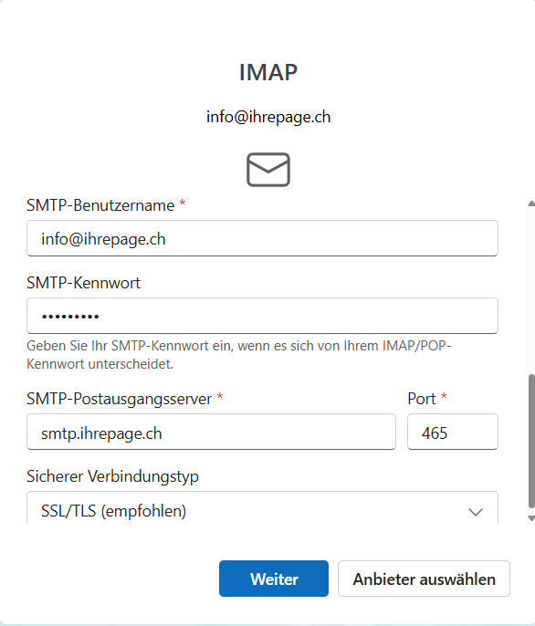 SMTP-Kennwort: das Passwort Ihrer E-Mail-Adresse