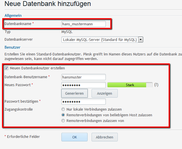 3. Der Datenbank Name kann frei gewählt werden, sollte aber keine Sonderzeichen enthalten. Es ist ausserdem zwingend, einen Datenbank Benutzer zu erstellen.